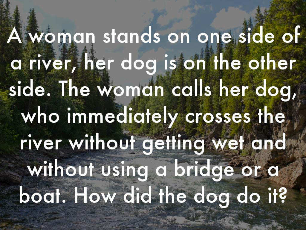 A woman stands on one side of a river, her dog is on the other side. The woman calls her dog, who immediately crosses the river without getting wet and without using a bridge or a boat. How did the dog do it?