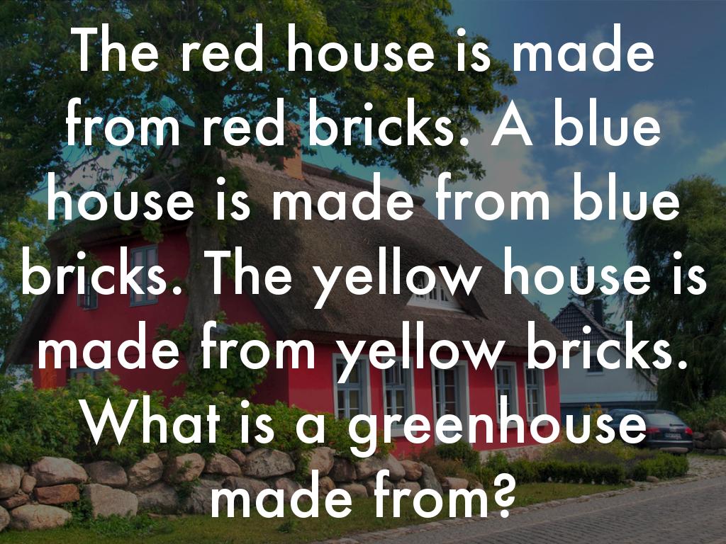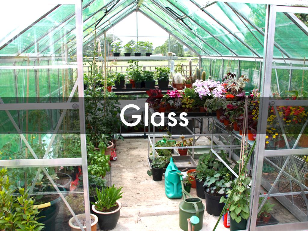 The red house is made from red bricks. A blue house is made from blue bricks. The yellow house is made from yellow bricks. What is a greenhouse made from?