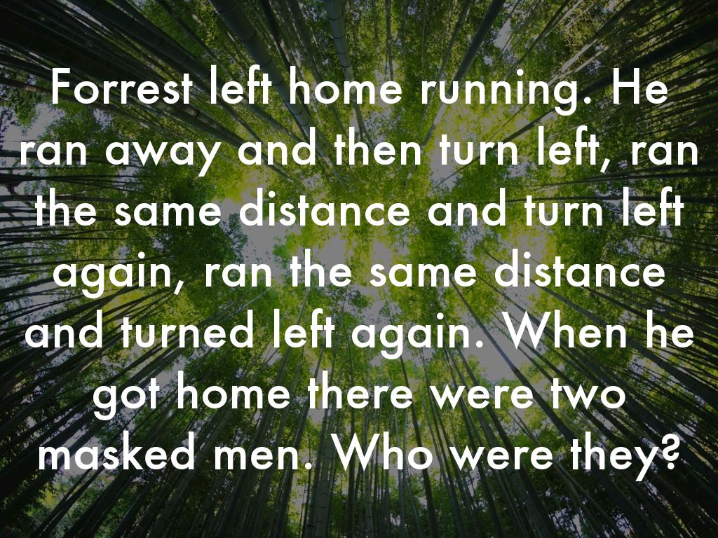 Forrest left home running. He ran away and then turn left, ran the same distance and turn left again, ran the same distance and turned left again. When he got home there were two masked men. Who were they?