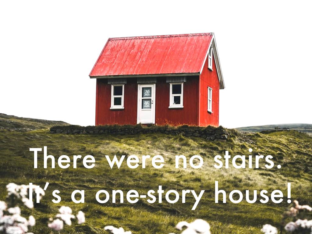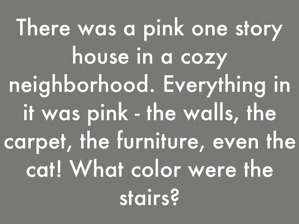 There was a pink one story house in a cozy neighborhood. Everything in it was pink - the walls, the carpet, the furniture, even the cat! What color were the stairs?