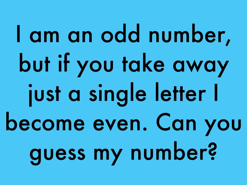 I am an odd number, but if you take away just a single letter I become even. Can you guess my number?