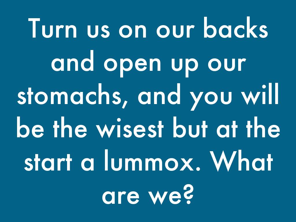 Turn us on our backs and open up our stomachs, and you will be the wisest but at the start a lummox. What are we?