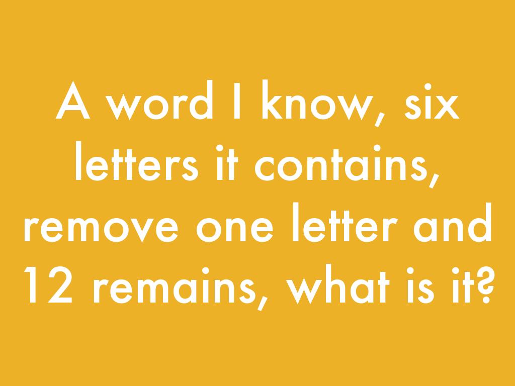A word I know, six letters it contains, remove one letter and 12 remains, what is it?