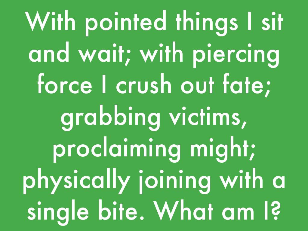 With pointed things I sit and wait; with piercing force I crush out fate; grabbing victims, proclaiming might; physically joining with a single bite. What am I?