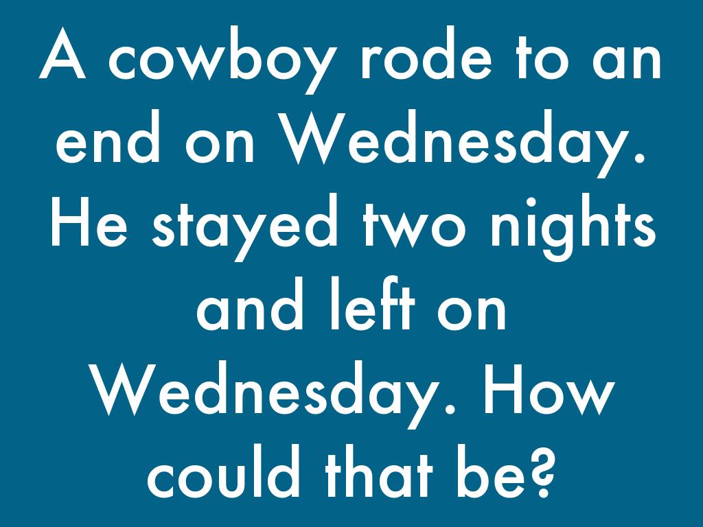 A cowboy rode to an end on Wednesday. He stayed two nights and left on Wednesday. How could that be?