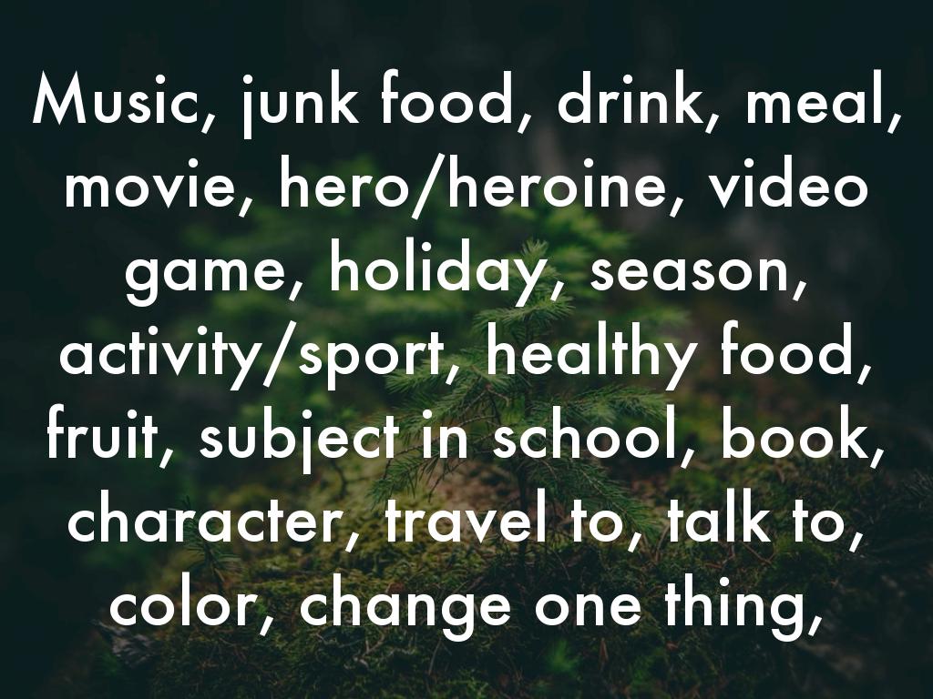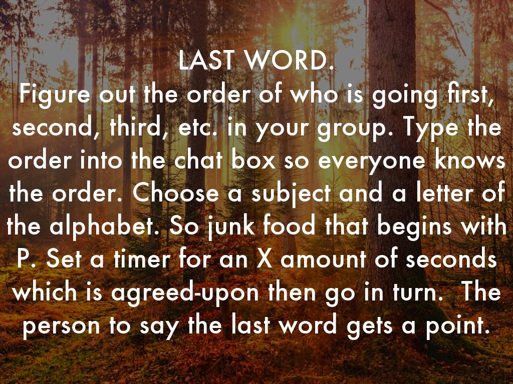 LAST WORD. Figure out the order of who is going first, second, third, etc. in your group. Type the order into the chat box so everyone knows the order. Choose a subject and a letter of the alphabet. So junk food that begins with P. Set a timer for an X amount of seconds which is agreed-upon then go in turn. The person to say the last word gets a point.