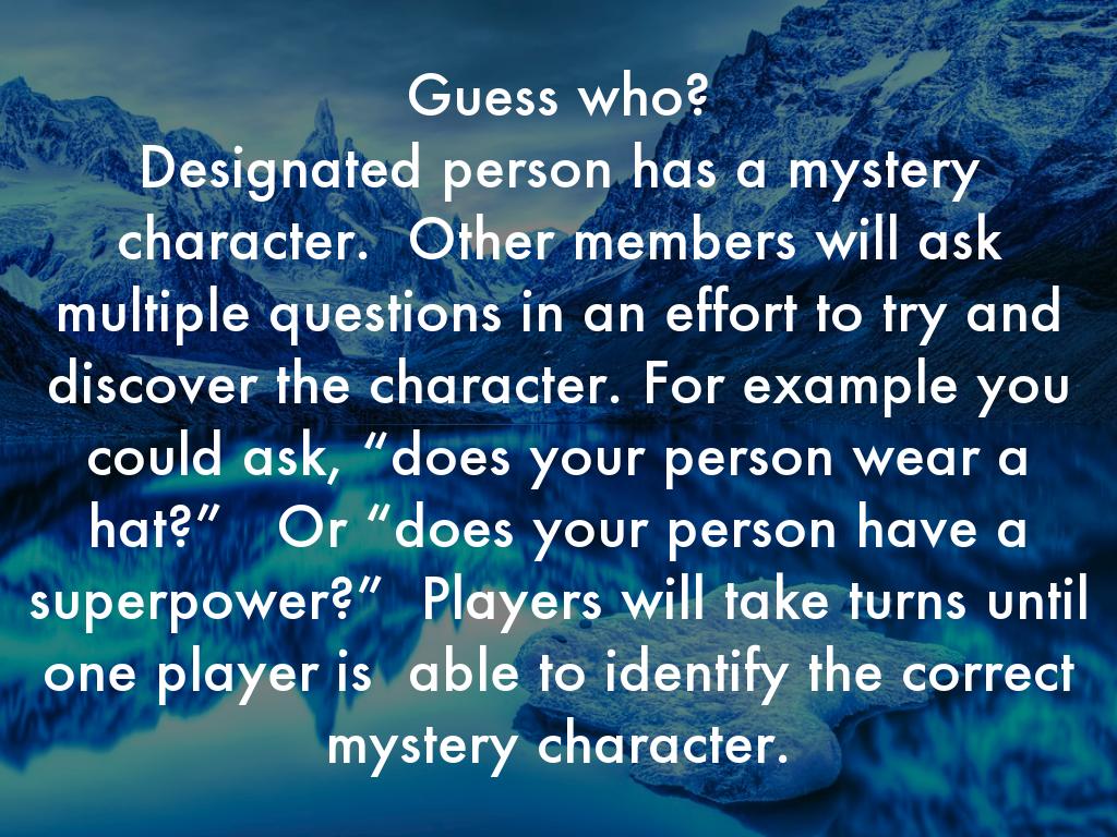 Guess who? Designated person has a mystery character. Other members will ask multiple questions in an effort to try and discover the character. For example you could ask, “does your person wear a hat?” Or “does your person have a superpower?” Players will take turns until one player is able to identify the correct mystery character.