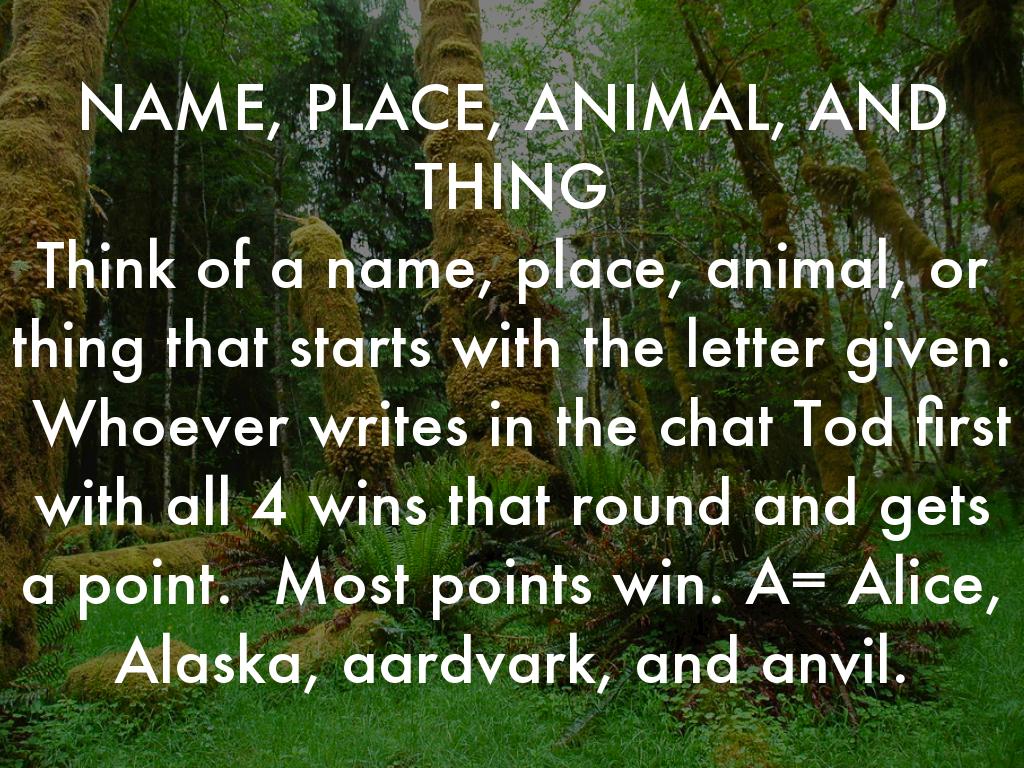 NAME, PLACE, ANIMAL, AND THING Think of a name, place, animal, or thing that starts with the letter given. Whoever writes in the chat Tod first with all 4 wins that round and gets a point. Most points win. A= Alice, Alaska, aardvark, and anvil.