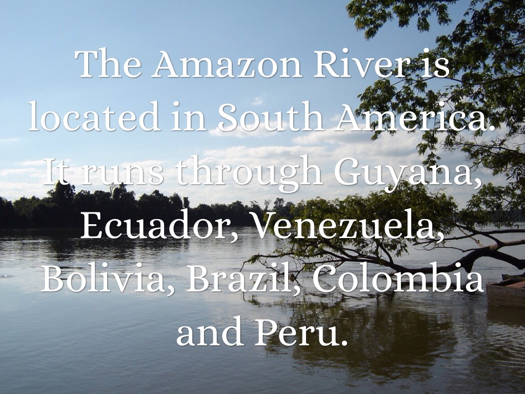 The Amazon River is located in South America. It runs through Guyana, Ecuador, Venezuela, Bolivia, Brazil, Colombia and Peru.