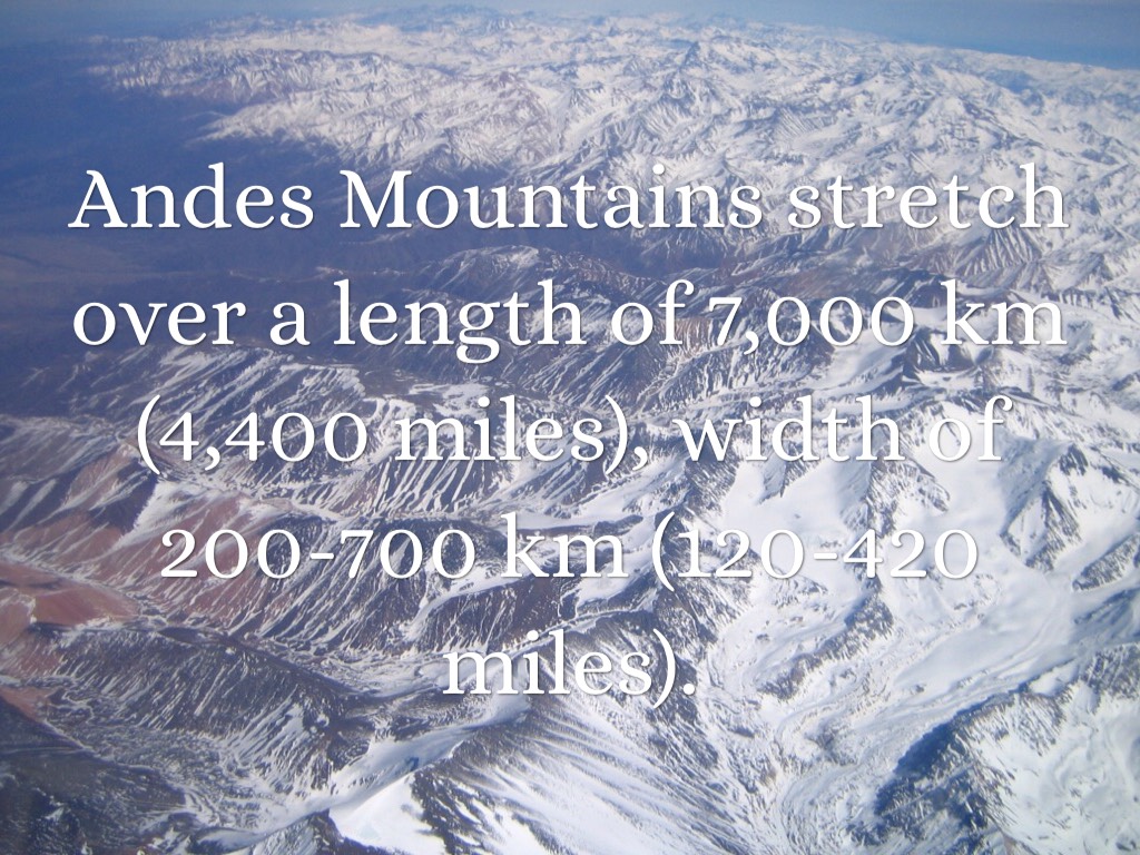 Fact 1Andes Mountains stretch over a length of 7,000 km (4,400 miles), width of 200-700 km (120-420 miles).