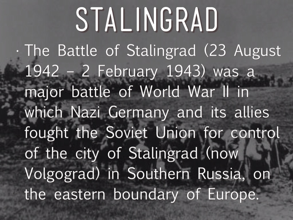 The Battle of Stalingrad (23 August 1942 – 2 February 1943) was a major battle of World War II in which Nazi Germany and its allies fought the Soviet Union for control of the city of Stalingrad (now Volgograd) in Southern Russia, on the eastern boundary of Europe.