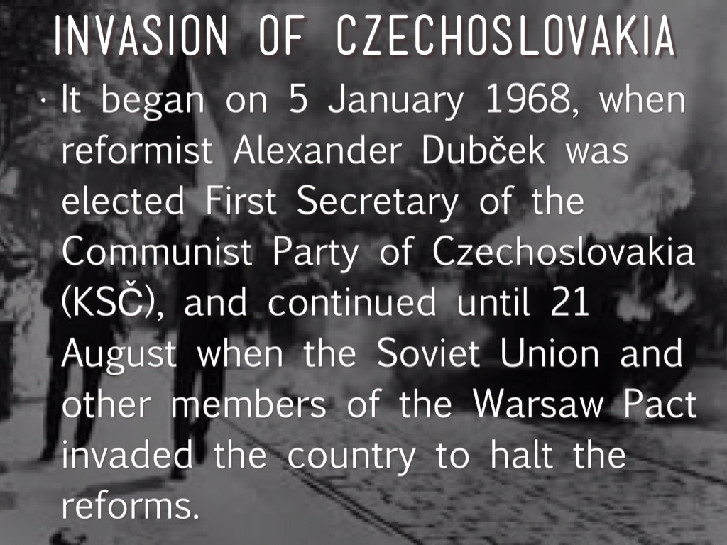 It began on 5 January 1968, when reformist Alexander Dubček was elected First Secretary of the Communist Party of Czechoslovakia (KSČ), and continued until 21 August when the Soviet Union and other members of the Warsaw Pact invaded the country to halt the reforms.