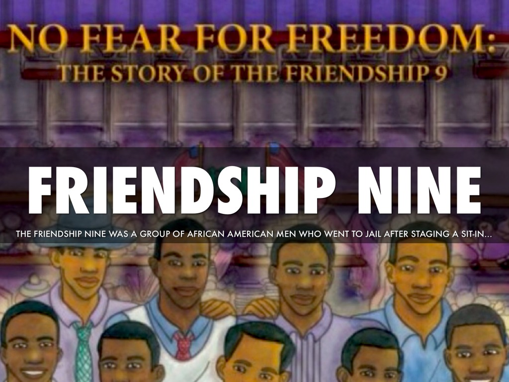 THE FRIENDSHIP NINE WAS A GROUP OF AFRICAN AMERICAN MEN WHO WENT TO JAIL AFTER STAGING A SIT-IN AT A SEGREGATED MCCRORY'S LUNCH COUNTER IN ROCK HILL, SOUTH CAROLINA IN 1961.