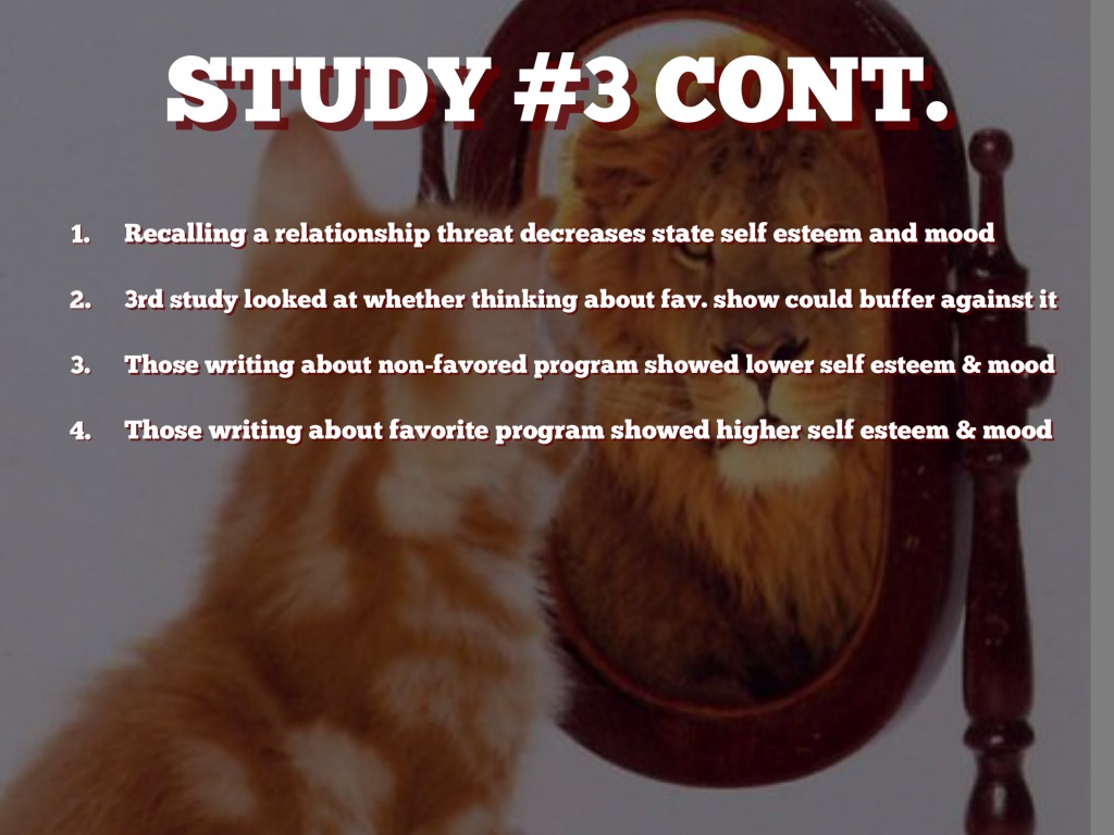 - 3rd study looked at whether thinking about fav. show could buffer against it