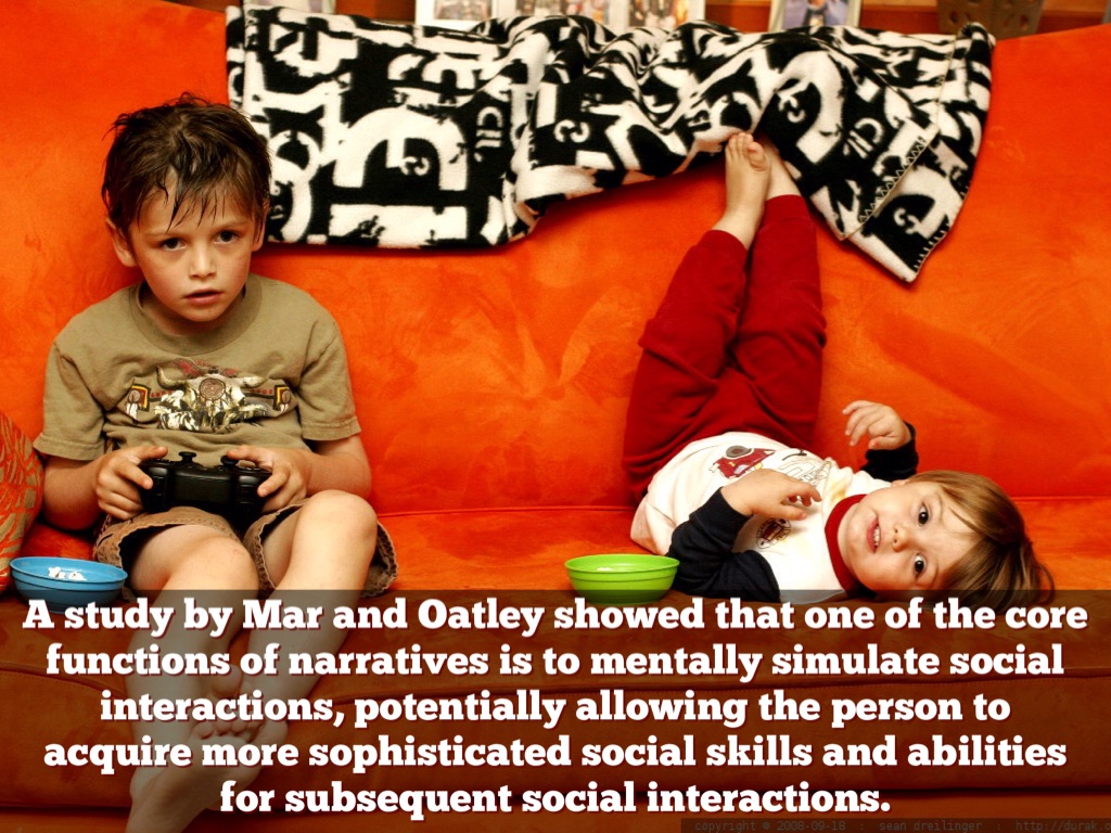 A study by Mar and Oatley showed that one of the core functions of narratives is to mentally simulate social interactions, potentially allowing the person to acquire more sophisticated social skills and abilities for subsequent social interactions.