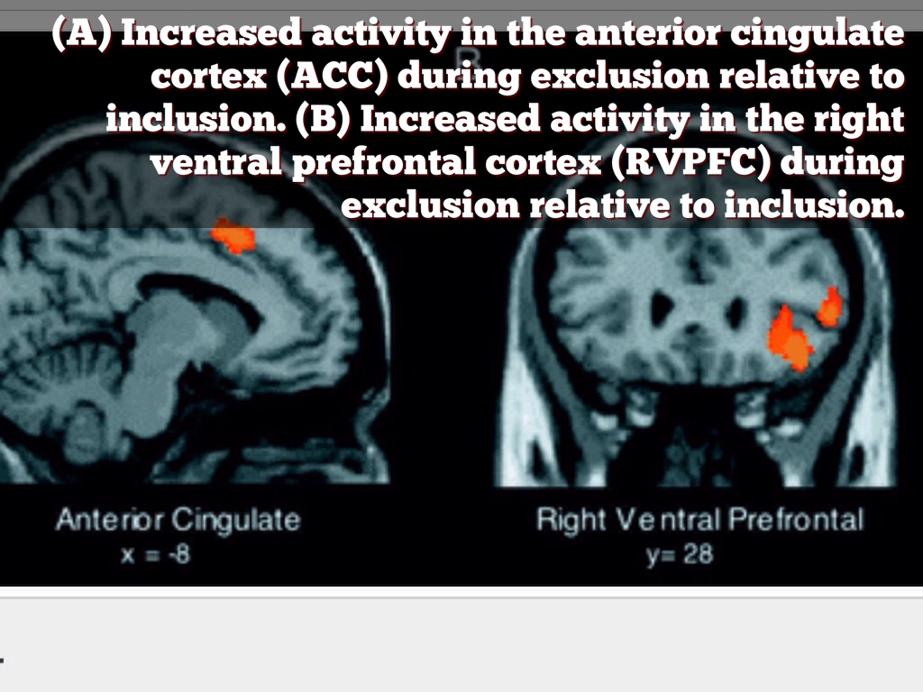 (A) Increased activity in the anterior cingulate cortex (ACC) during exclusion relative to inclusion. (B) Increased activity in the right ventral prefrontal cortex (RVPFC) during exclusion relative to inclusion.