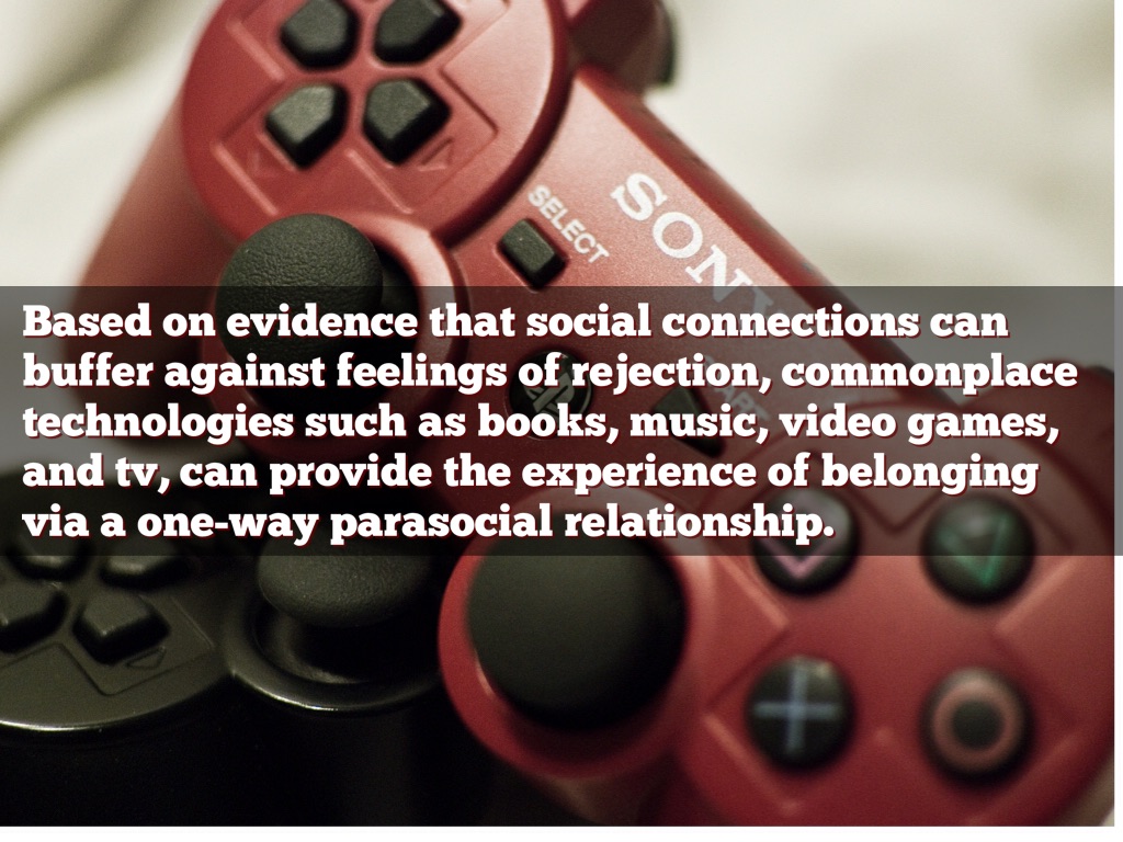 Based on evidence that social connections can buffer against feelings of rejection, commonplace technologies such as books, music, video games, and tv, can provide the experience of belonging via a one-way parasocial relationship.