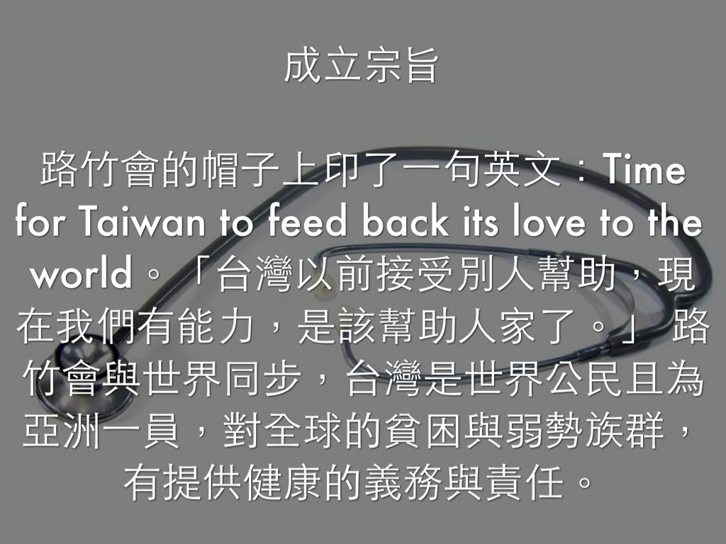 路竹會的帽子上印了一句英文:Time for Taiwan to feed back its love to the world。「台灣以前接受別人幫助,現在我們有能力,是該幫助人家了。」 路竹會與世界同步,台灣是世界公民且為亞洲一員,對全球的貧困與弱勢族群,有提供健康的義務與責任。