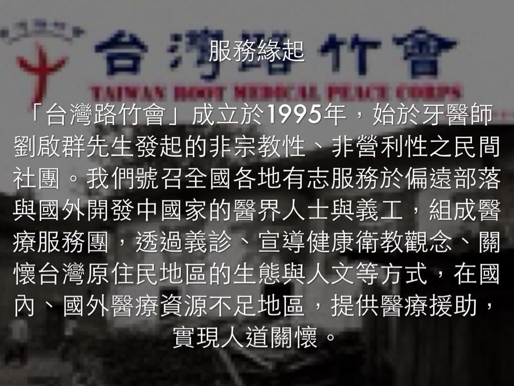 「台灣路竹會」成立於1995年,始於牙醫師劉啟群先生發起的非宗教性、非營利性之民間社團。我們號召全國各地有志服務於偏遠部落與國外開發中國家的醫界人士與義工,組成醫療服務團,透過義診、宣導健康衛教觀念、關懷台灣原住民地區的生態與人文等方式,在國內、國外醫療資源不足地區,提供醫療援助,實現人道關懷。