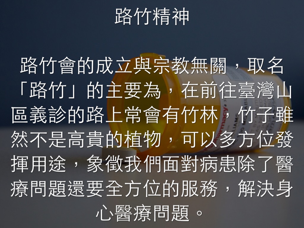 路竹會的成立與宗教無關,取名「路竹」的主要為,在前往臺灣山區義診的路上常會有竹林,竹子雖然不是高貴的植物,可以多方位發揮用途,象徵我們面對病患除了醫療問題還要全方位的服務,解決身心醫療問題。