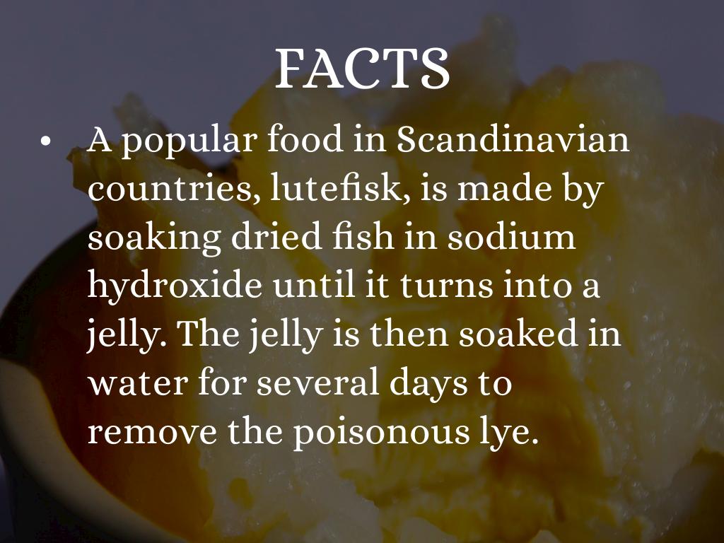 A popular food in Scandinavian countries, lutefisk, is made by soaking dried fish in sodium hydroxide until it turns into a jelly. The jelly is then soaked in water for several days to remove the poisonous lye.