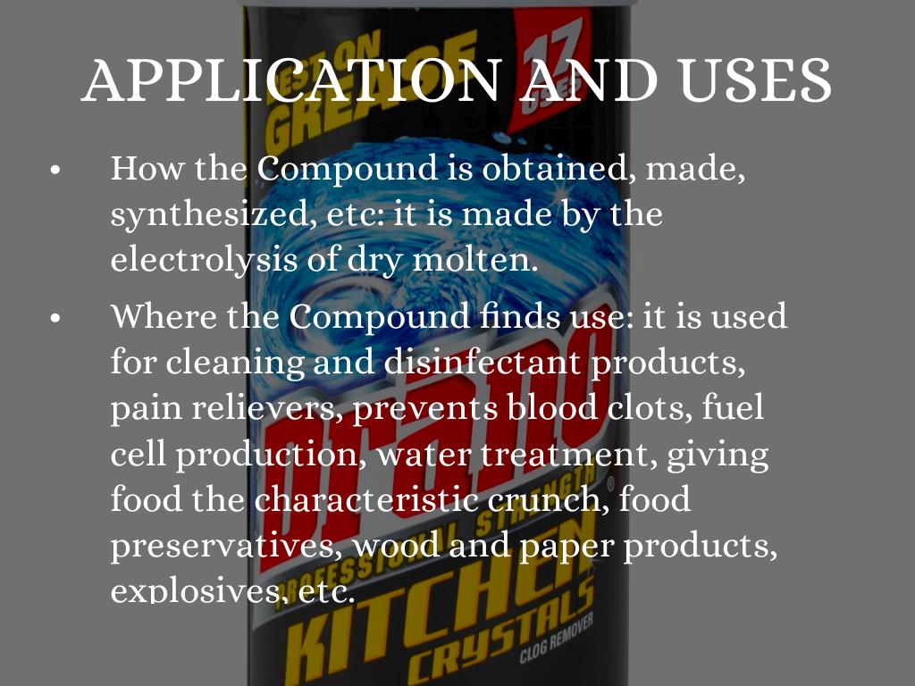 Where the Compound finds use: it is used for cleaning and disinfectant products, pain relievers, prevents blood clots, fuel cell production, water treatment, giving food the characteristic crunch, food preservatives, wood and paper products, explosives, etc.