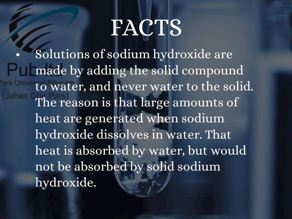 Solutions of sodium hydroxide are made by adding the solid compound to water, and never water to the solid. The reason is that large amounts of heat are generated when sodium hydroxide dissolves in water. That heat is absorbed by water, but would not be absorbed by solid sodium hydroxide.
