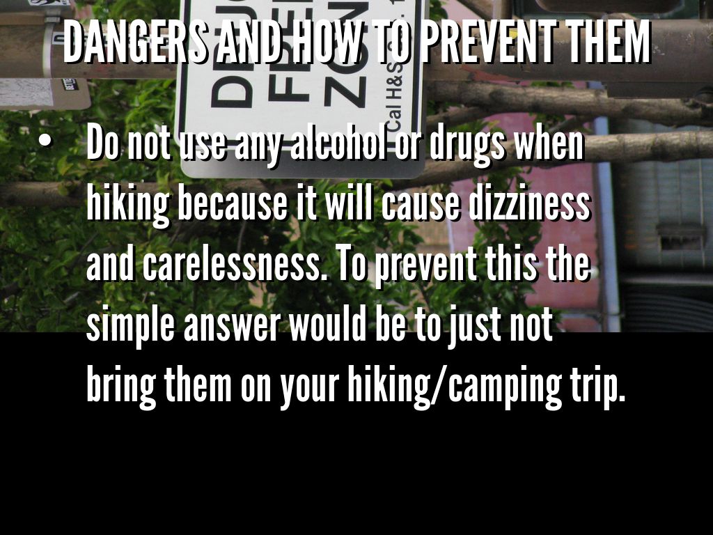 Do not use any alcohol or drugs when hiking because it will cause dizziness and carelessness. To prevent this the simple answer would be to just not bring them on your hiking/camping trip.