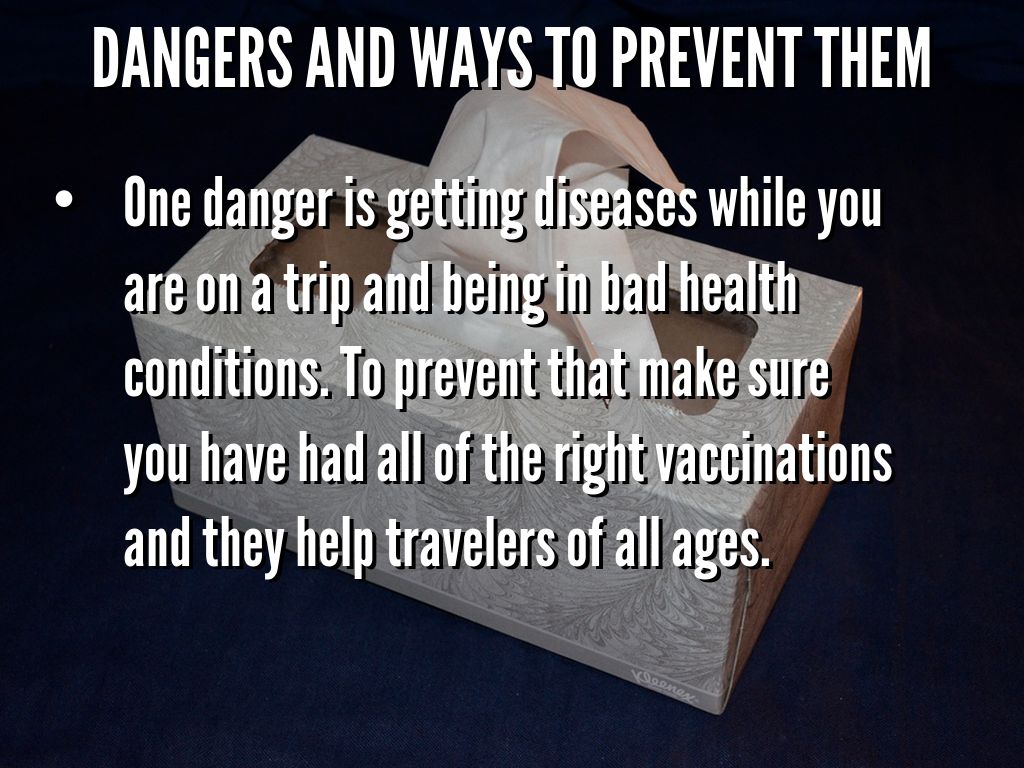 One danger is getting diseases while you are on a trip and being in bad health conditions. To prevent that make sure you have had all of the right vaccinations and they help travelers of all ages.