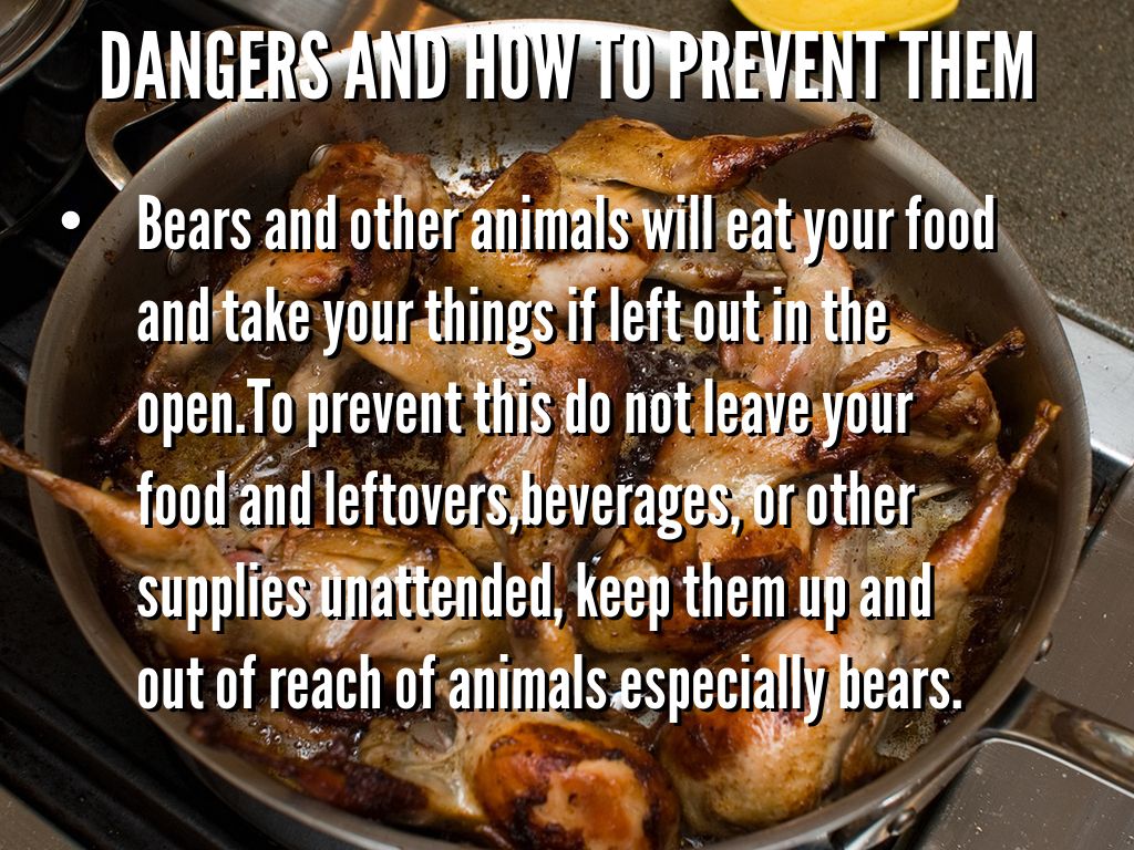 Bears and other animals will eat your food and take your things if left out in the open.To prevent this do not leave your food and leftovers,beverages, or other supplies unattended, keep them up and out of reach of animals especially bears.