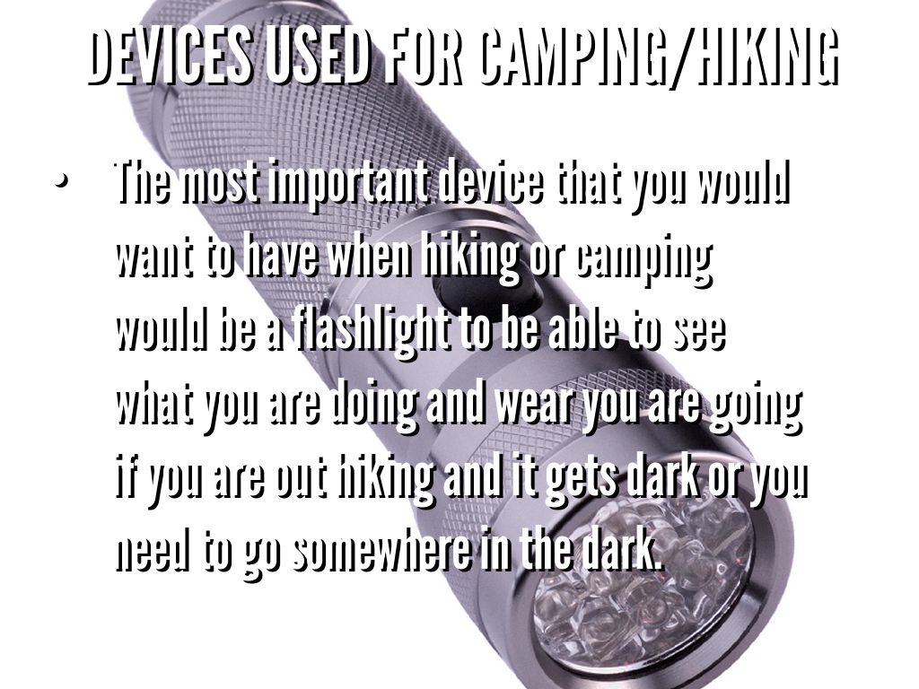 The most important device that you would want to have when hiking or camping would be a flashlight to be able to see what you are doing and wear you are going if you are out hiking and it gets dark or you need to go somewhere in the dark.