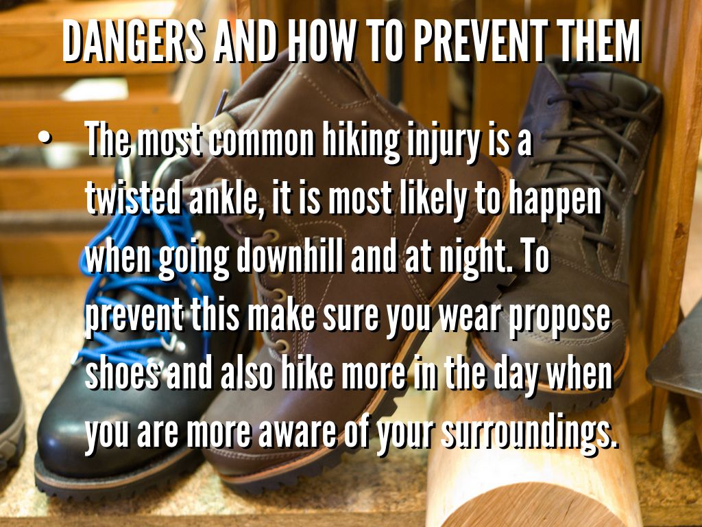 The most common hiking injury is a twisted ankle, it is most likely to happen when going downhill and at night. To prevent this make sure you wear propose shoes and also hike more in the day when you are more aware of your surroundings.