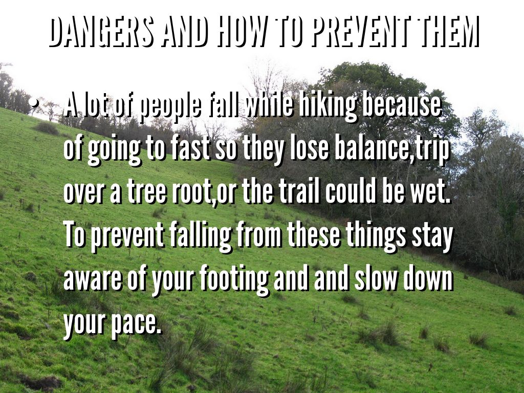 A lot of people fall while hiking because of going to fast so they lose balance,trip over a tree root,or the trail could be wet. To prevent falling from these things stay aware of your footing and and slow down your pace.
