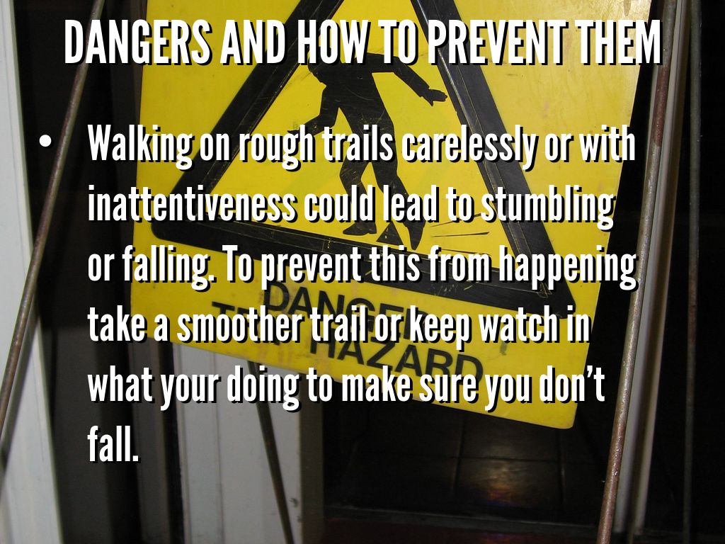 Walking on rough trails carelessly or with inattentiveness could lead to stumbling or falling. To prevent this from happening take a smoother trail or keep watch in what your doing to make sure you don't fall.