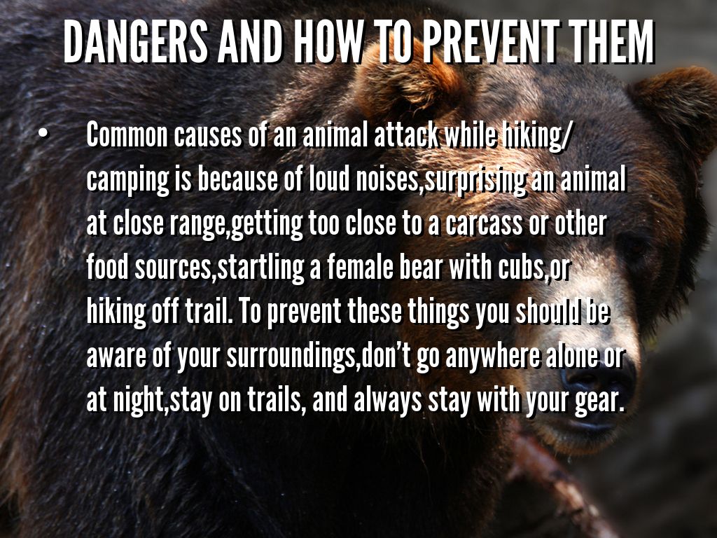 Common causes of an animal attack while hiking/ camping is because of loud noises,surprising an animal at close range,getting too close to a carcass or other food sources,startling a female bear with cubs,or hiking off trail. To prevent these things you should be aware of your surroundings,don't go anywhere alone or at night,stay on trails, and always stay with your gear.