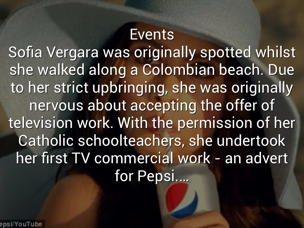 Sofia Vergara was originally spotted whilst she walked along a Colombian beach. Due to her strict upbringing, she was originally nervous about accepting the offer of television work. With the permission of her Catholic schoolteachers, she undertook her first TV commercial work - an advert for Pepsi.