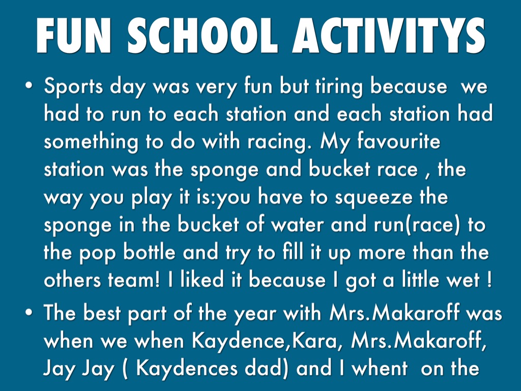 • Sports day was very fun but tiring because we had to run to each station and each station had something to do with racing. My favourite station was the sponge and bucket race , the way you play it is:you have to squeeze the sponge in the bucket of water and run(race) to the pop bottle and try to fill it up more than the others team! I liked it because I got a little wet !