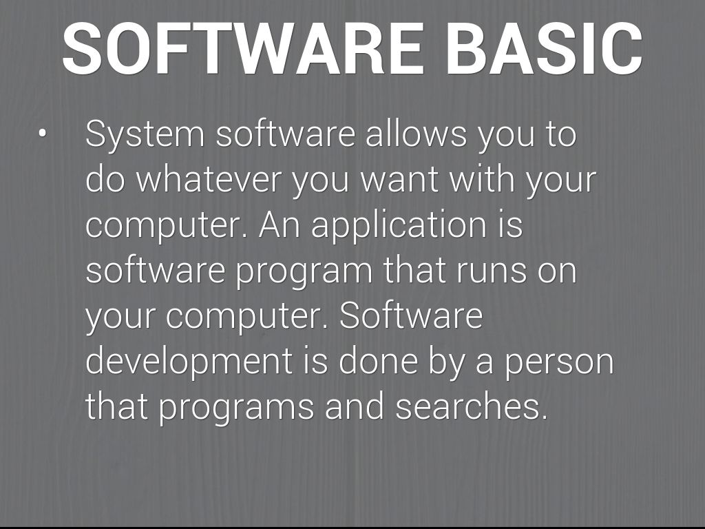 System software allows you to do whatever you want with your computer. An application is software program that runs on your computer. Software development is done by a person that programs and searches.
