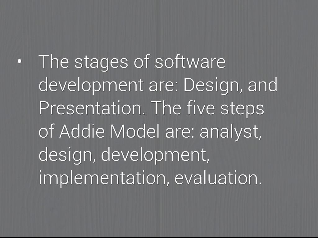 The stages of software development are: Design, and Presentation. The five steps of Addie Model are: analyst, design, development, implementation, evaluation.