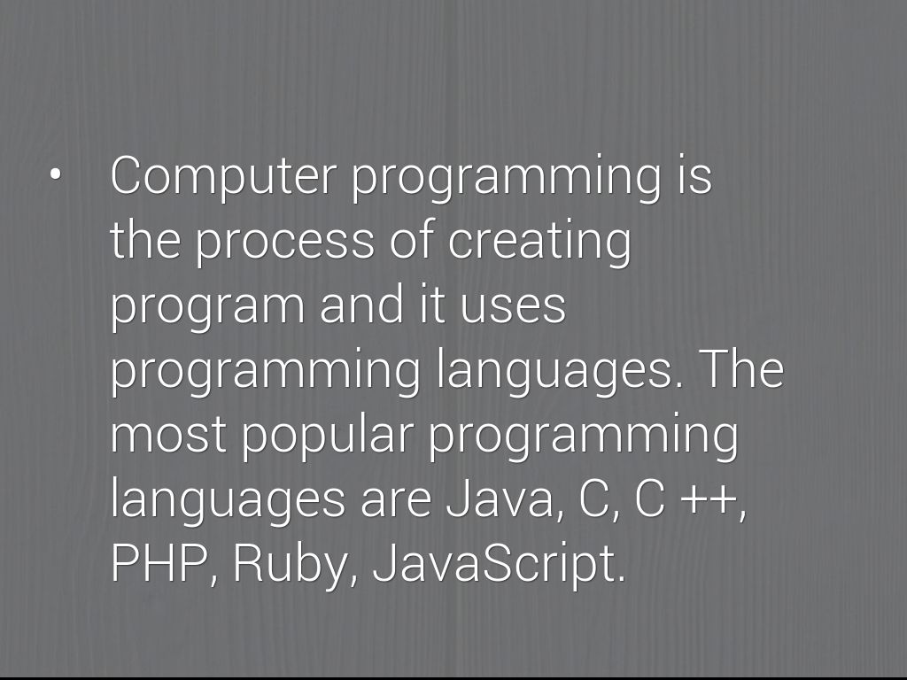 Computer programming is the process of creating program and it uses programming languages. The most popular programming languages are Java, C, C ++, PHP, Ruby, JavaScript.
