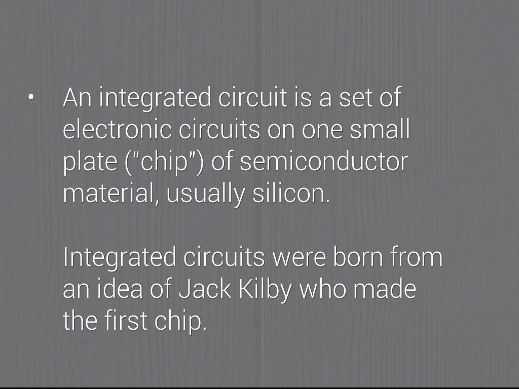 An integrated circuit is a set of electronic circuits on one small plate ("chip") of semiconductor material, usually silicon.