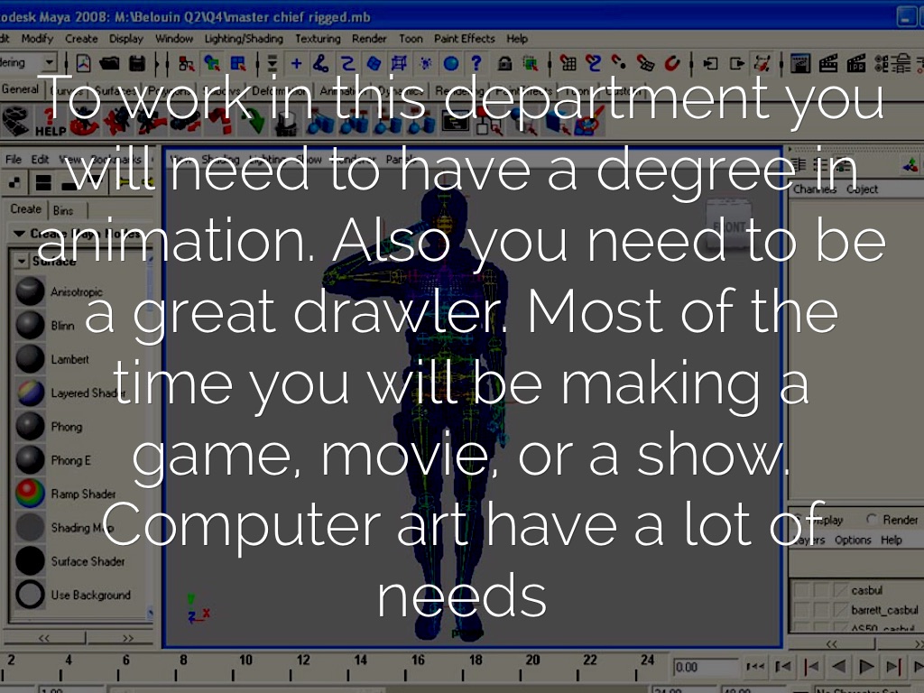 To work in this department you will need to have a degree in animation. Also you need to be a great drawler. Most of the time you will be making a game, movie, or a show. Computer art have a lot of needs