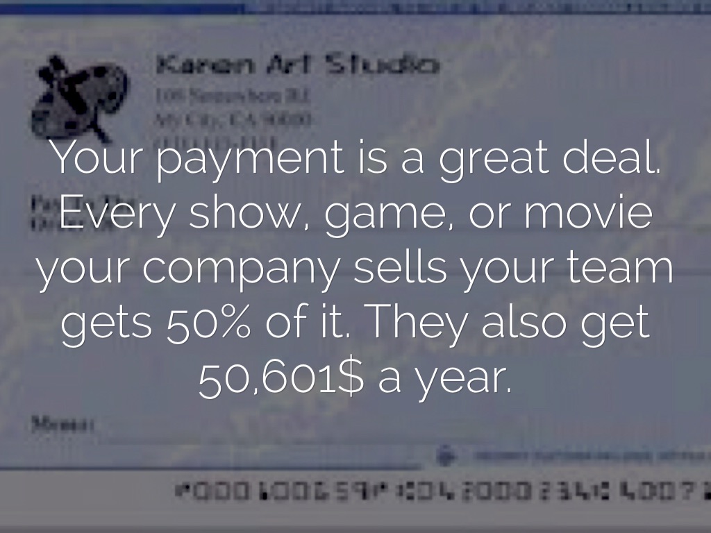 Your payment is a great deal. Every show, game, or movie your company sells your team gets 50% of it. They also get 50,601$ a year.