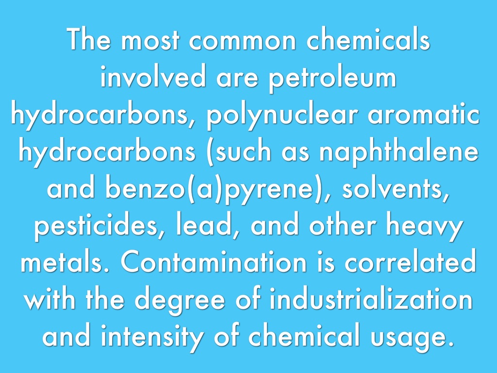 The most common chemicals involved are petroleum hydrocarbons, polynuclear aromatic hydrocarbons (such as naphthalene and benzo(a)pyrene), solvents, pesticides, lead, and other heavy metals. Contamination is correlated with the degree of industrialization and intensity of chemical usage.