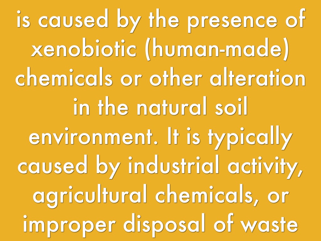 is caused by the presence of xenobiotic (human-made) chemicals or other alteration in the natural soil environment. It is typically caused by industrial activity, agricultural chemicals, or improper disposal of waste