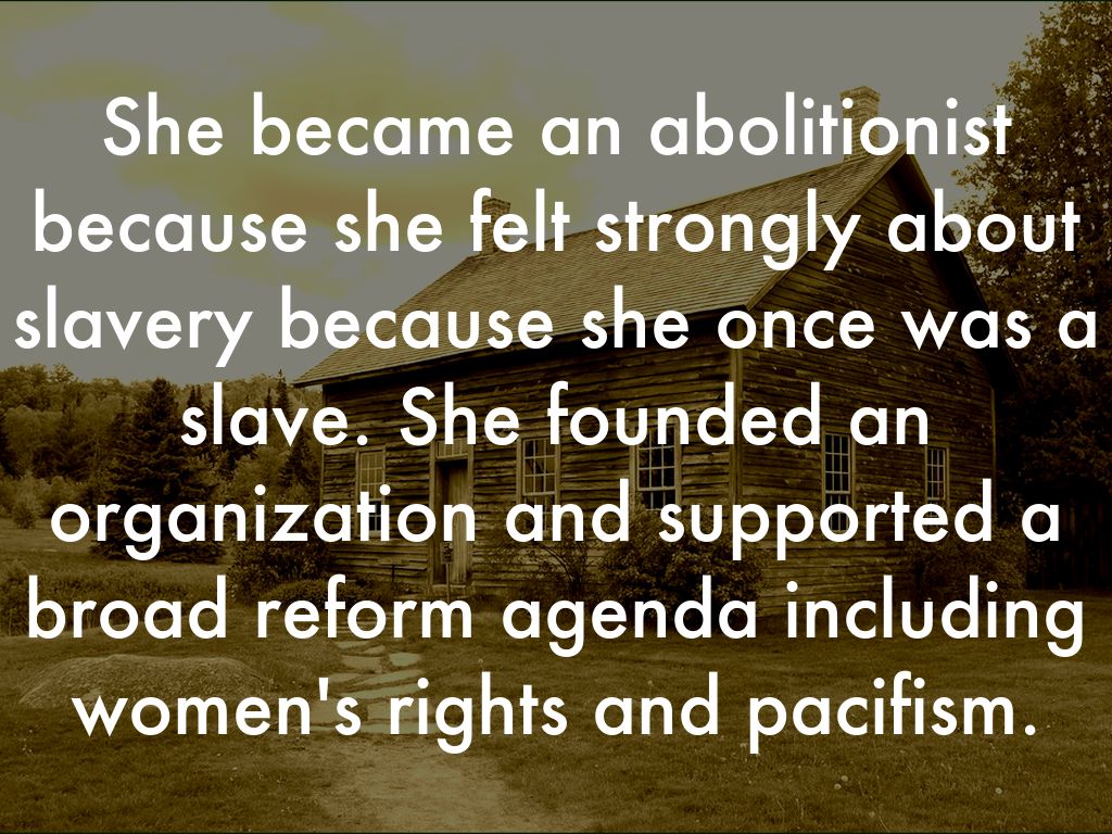 She became an abolitionist because she felt strongly about slavery because she once was a slave. She founded an organization and supported a broad reform agenda including women's rights and pacifism.