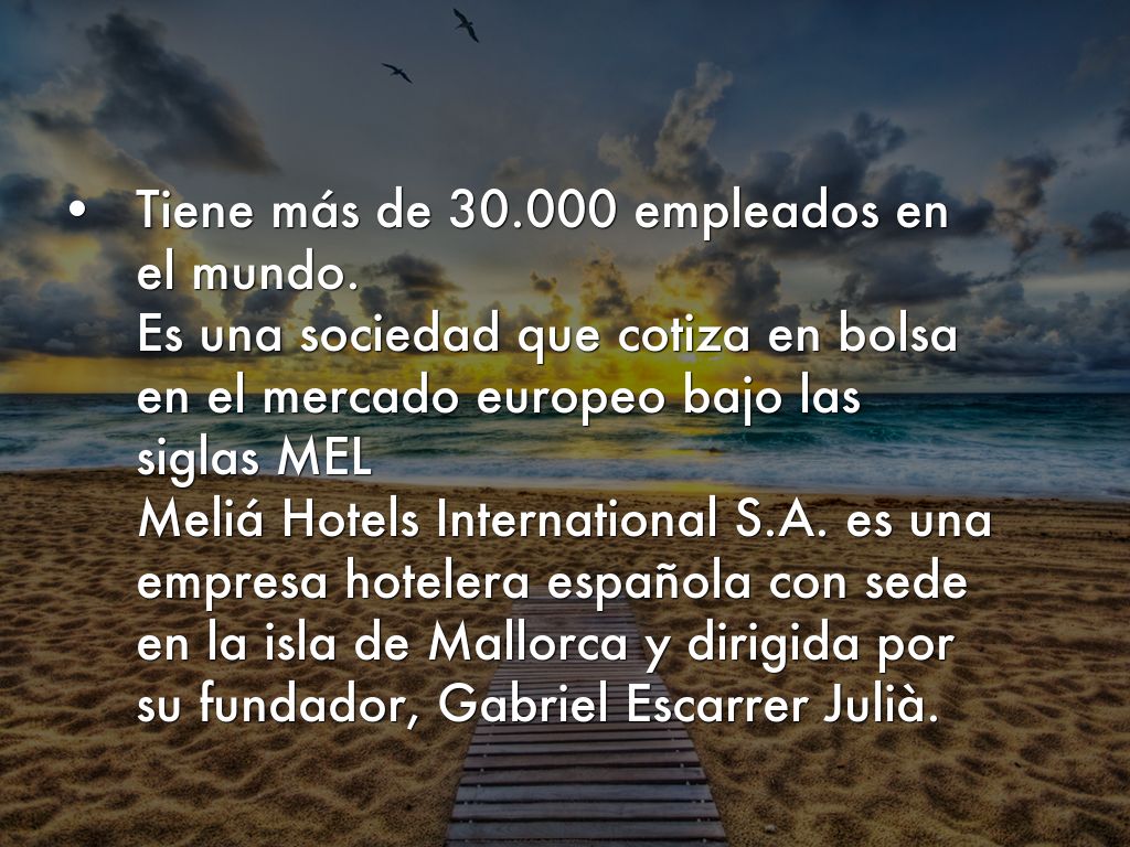 • Tiene más de 30.000 empleados en el mundo. Es una sociedad que cotiza en bolsa en el mercado europeo bajo las siglas MEL Meliá Hotels International S.A. es una empresa hotelera española con sede en la isla de Mallorca y dirigida por su fundador, Gabriel Escarrer Julià.
