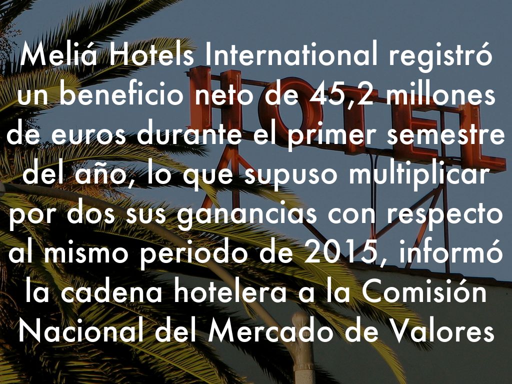 Meliá Hotels International registró un beneficio neto de 45,2 millones de euros durante el primer semestre del año, lo que supuso multiplicar por dos sus ganancias con respecto al mismo periodo de 2015, informó la cadena hotelera a la Comisión Nacional del Mercado de Valores
