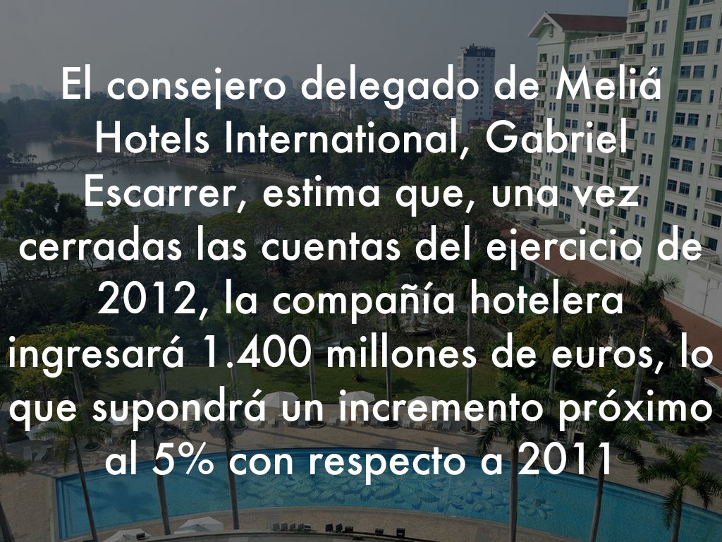 El consejero delegado de Meliá Hotels International, Gabriel Escarrer, estima que, una vez cerradas las cuentas del ejercicio de 2012, la compañía hotelera ingresará 1.400 millones de euros, lo que supondrá un incremento próximo al 5% con respecto a 2011