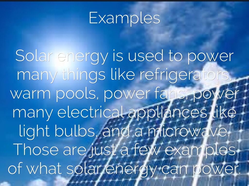 Solar energy is used to power many things like refrigerators, warm pools, power fans, power many electrical appliances like light bulbs, and a microwave. Those are just a few examples of what solar energy can power.